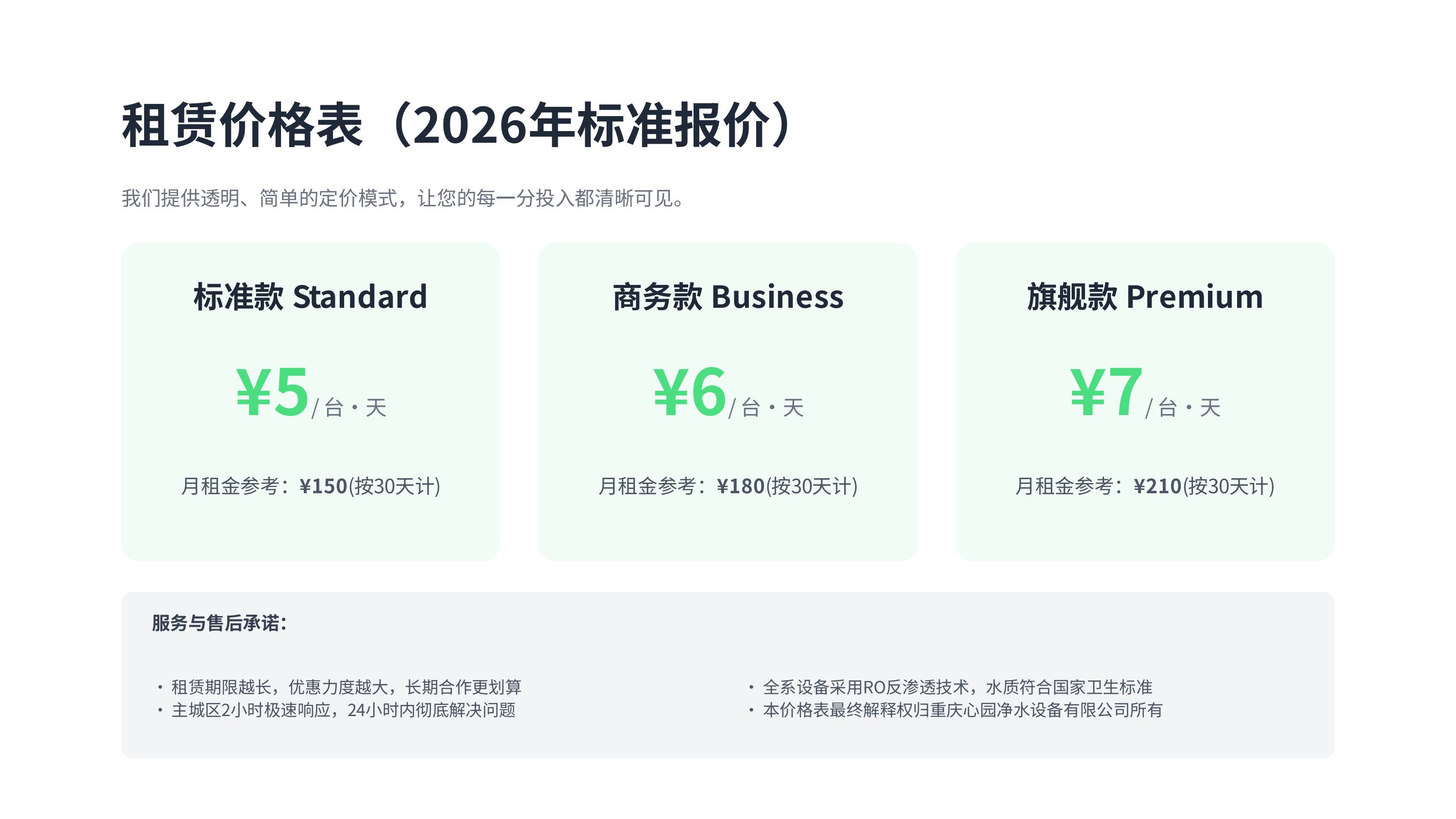 ✅ 免费上门勘测 + 方案设计✅ 免费安装 + 调试 + 使用培训✅ 免费定期巡检 + 维护保养✅ 免费滤芯更换(全程免耗材费)✅ 定期水质检测报告✅ 7×24 热线|主城 2 小时响应|24 小时解决故障