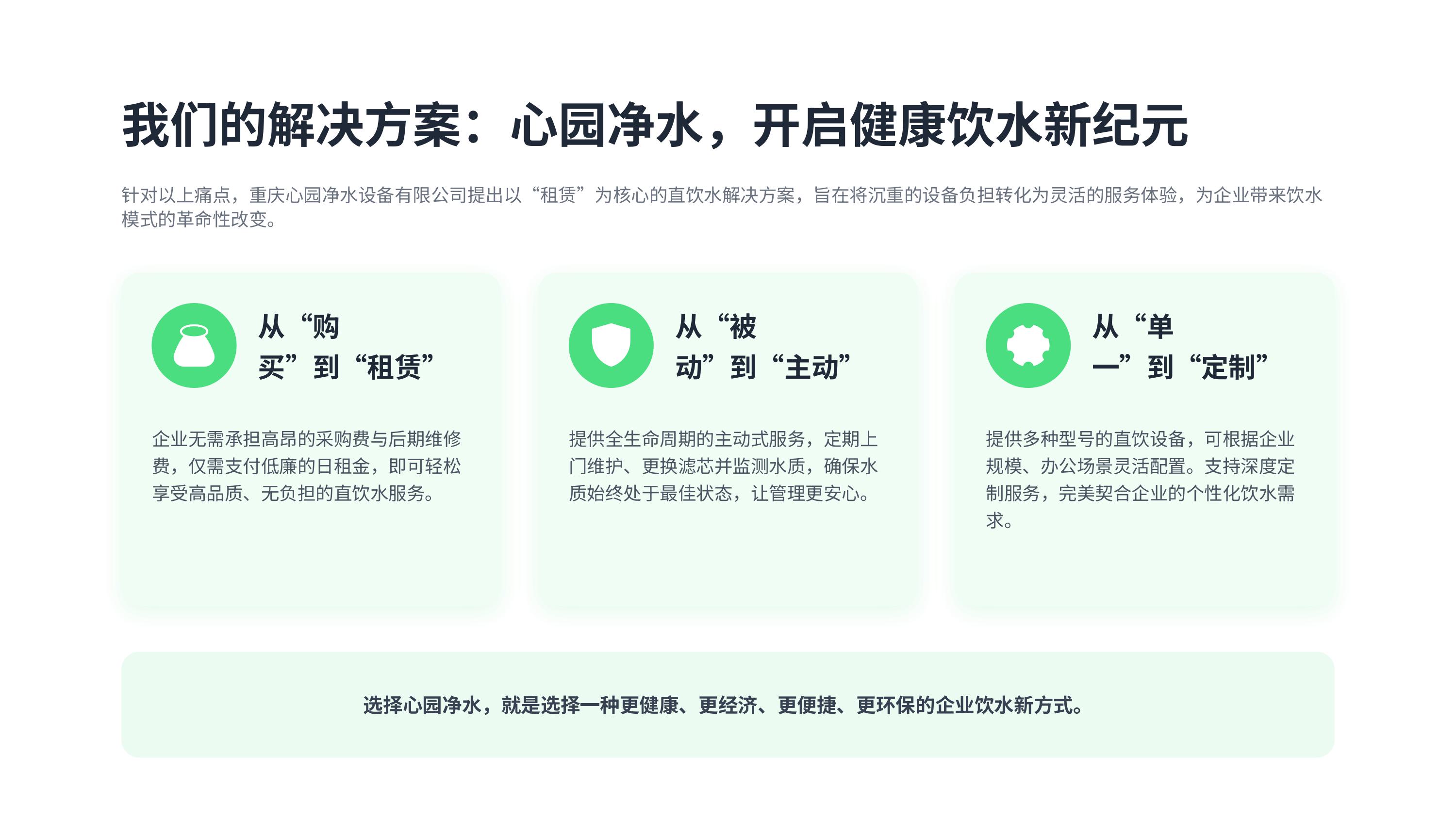 传统饮水痛点:成本高、管理烦、水质差、不环保心园方案:租赁模式・日均 5 元起・全程托管从购买→租赁|从被动→主动|从单一→定制